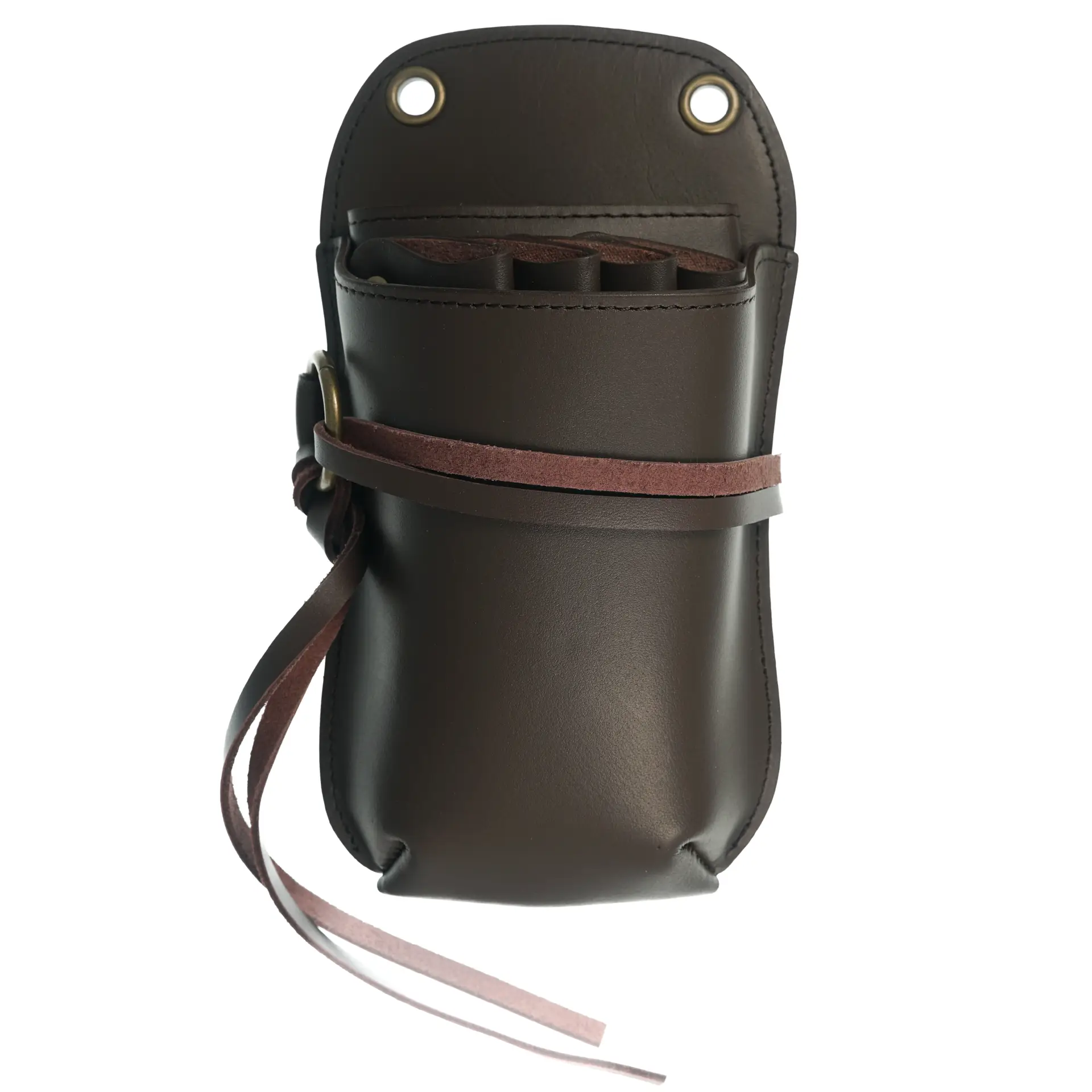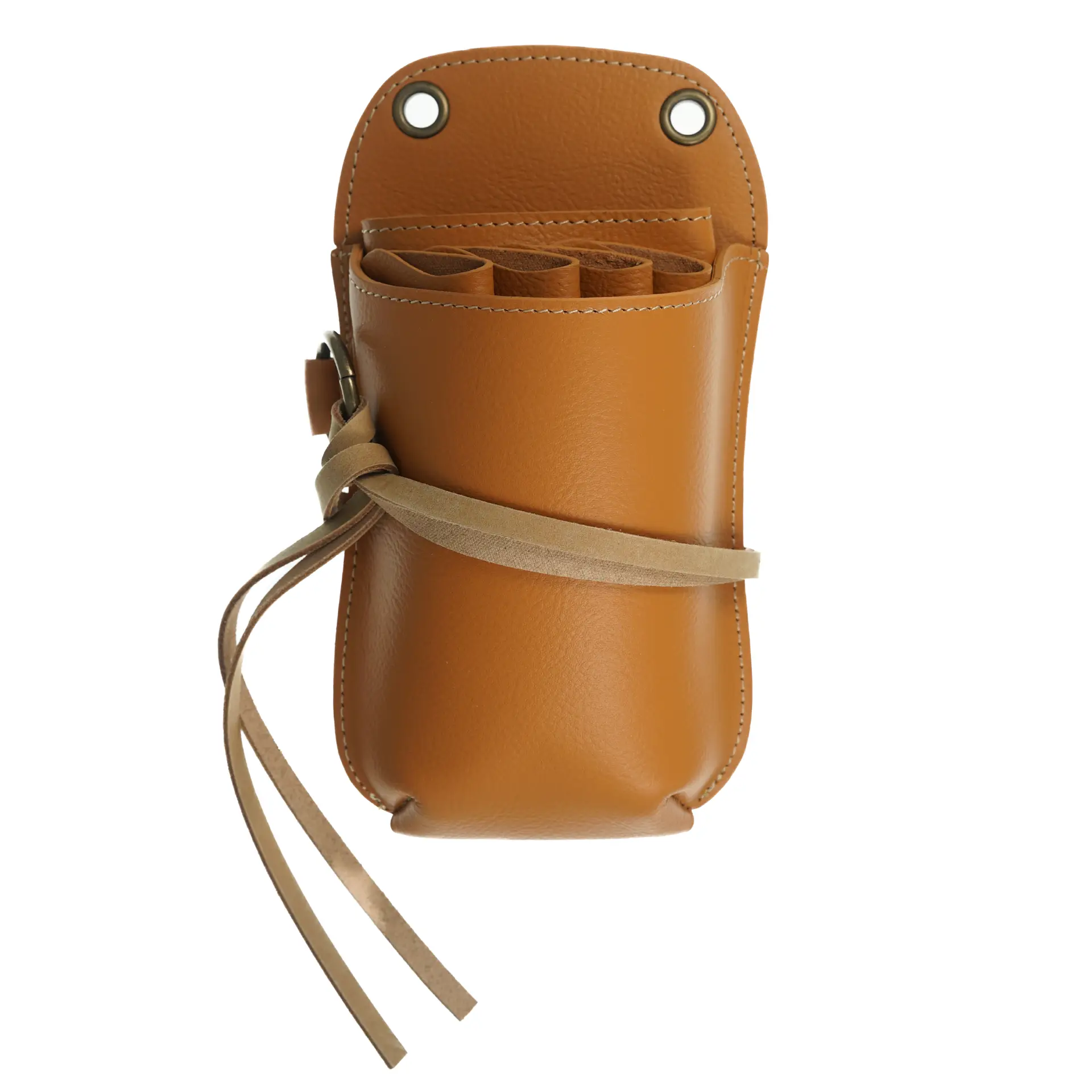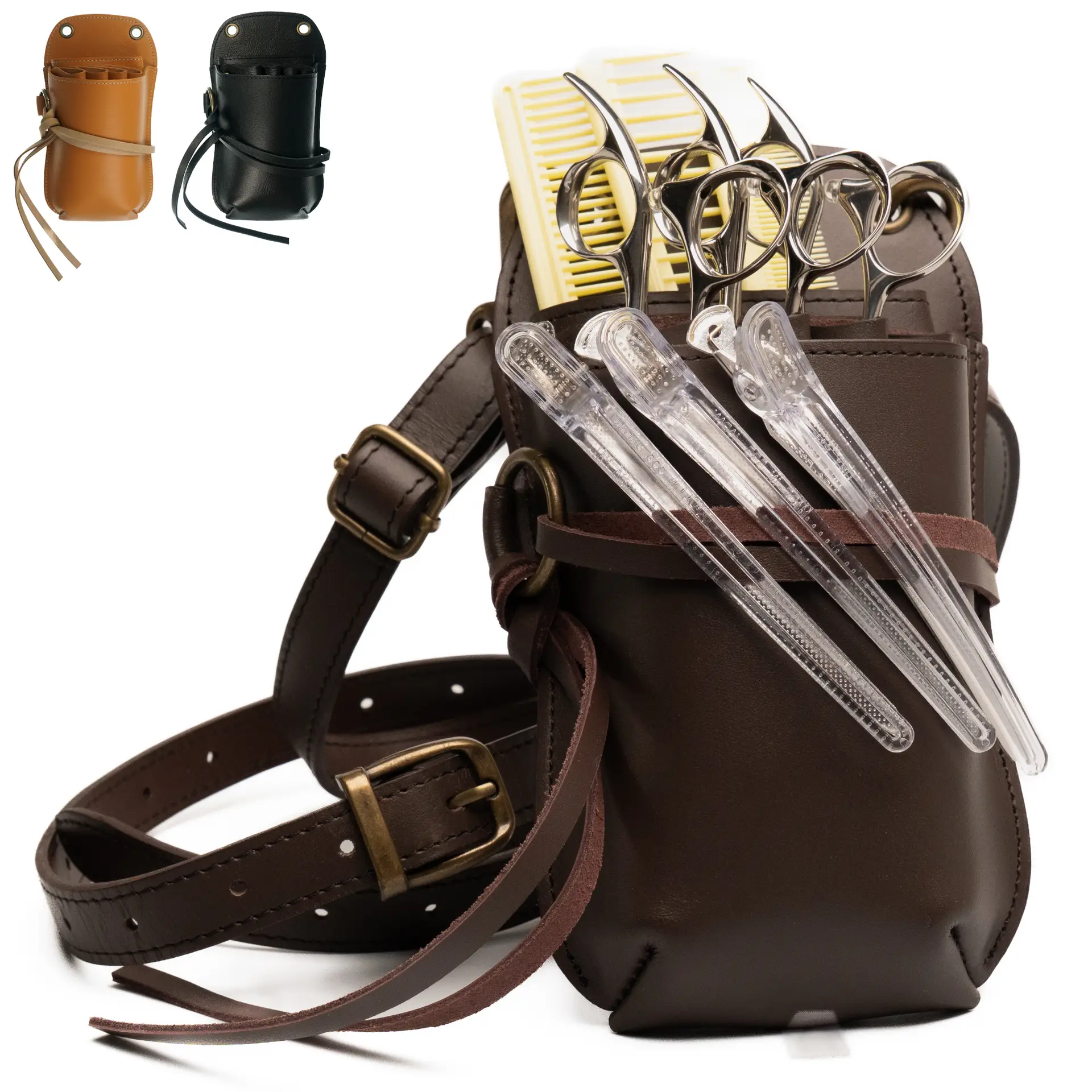 Each Artisan Leather Pouch is hand-crafted from real leather, being made with exceptional care and excellent design. The removable internal has 4 slots for scissors and a larger compartment that can hold many combs, large or small, or even additional scissors. You can remove this internals and unsnap the bottom flap for thorough cleaning. The small leather straps that tie around the front are excellent at holding an assortment of clips. It comes with a clip on adjustable belt that can be worn cross-body or around the waist. The belt if also great at holding additional clips.