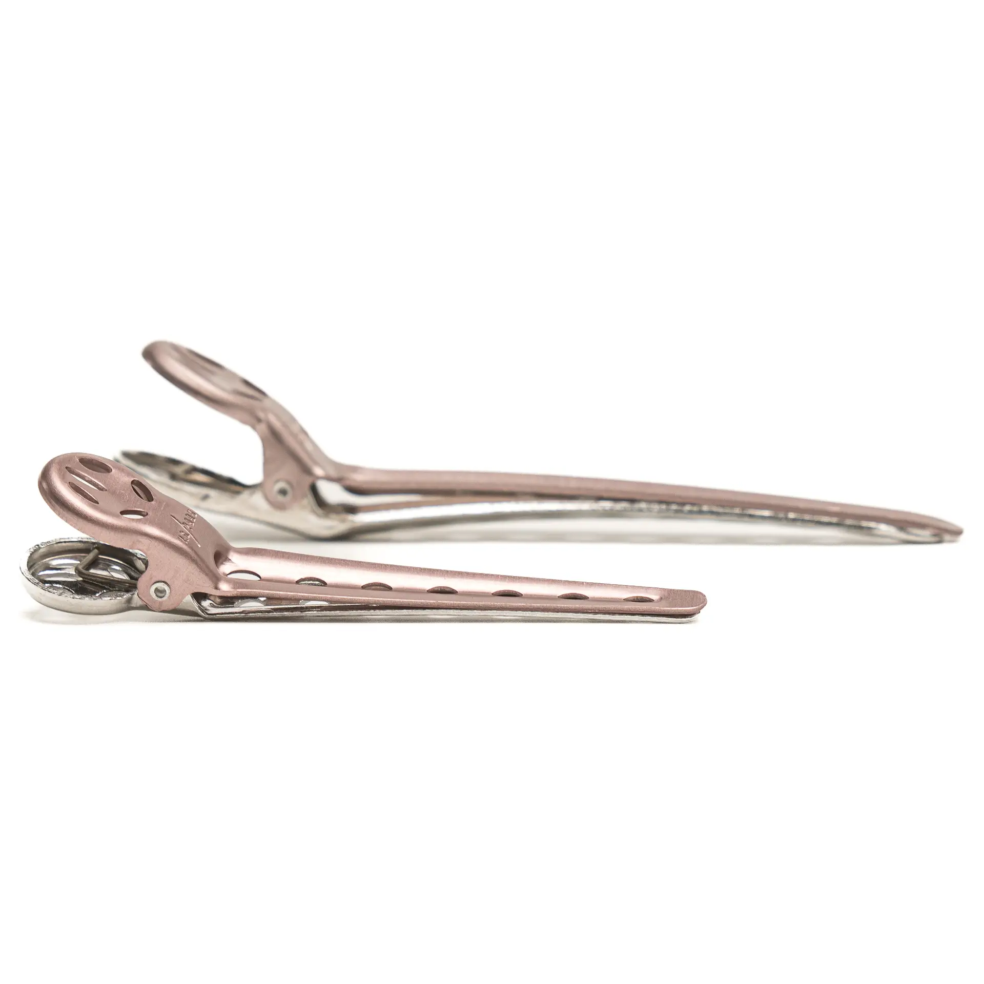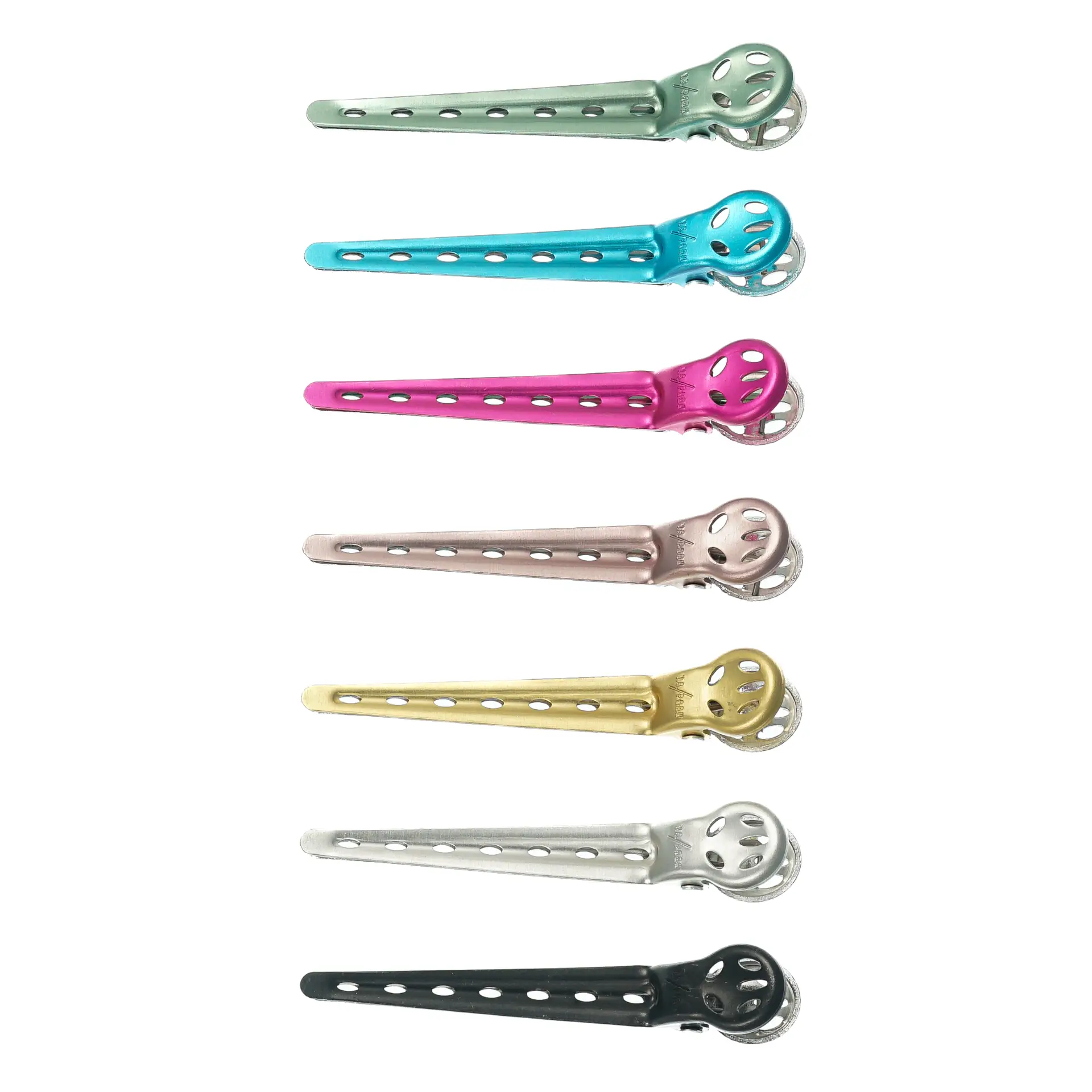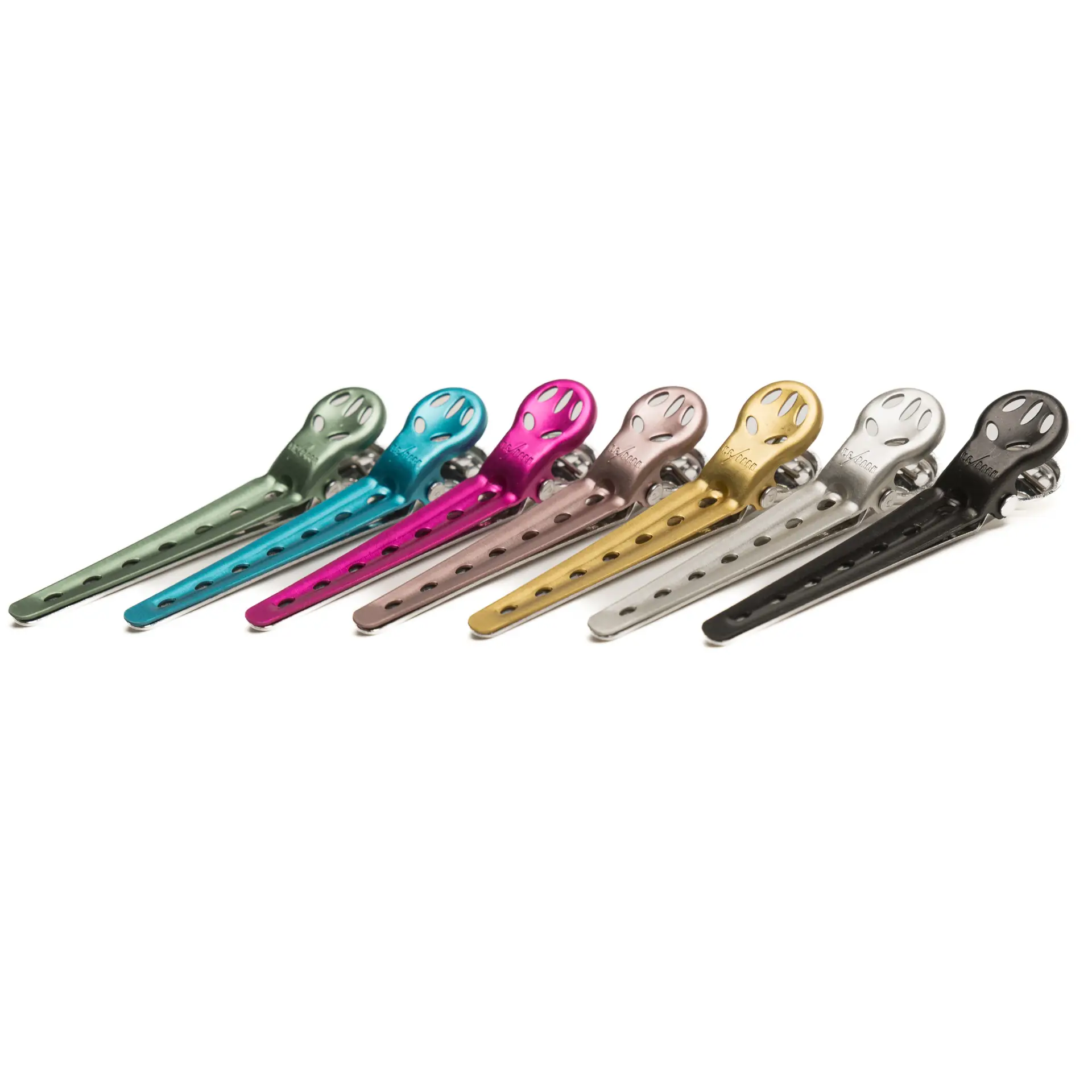 The YS Park Medium Clip are metal section clips made from anodized aluminum and have a super strong stainless steel spring. The clips are shorter than the YS Park Pro Clip, slimmer, flatter with only a slight curve, but utilizing the new stronger industrial design with same thumb and tension design. They also have a small indent that secures the hold and prevent hair from slipping. The pads have been flattened out and made oval for easier opening and a stronger grip than the previous YS Park Medium Clip. The flatter design works well to dent the hair less or no dent at all. Great for styling, finishing or precision cutting in small areas/sections.